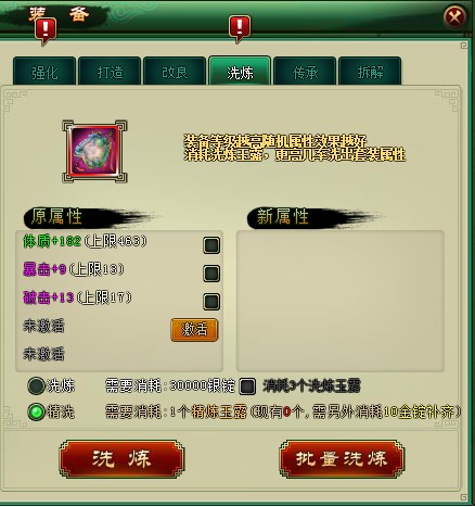 洗练装备的方式分为洗练和精洗两种,精洗的效果好于洗练的效果,但需要消耗2个精炼玉露。