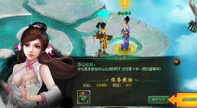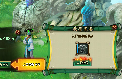 智慧的游戏引导系统在教我们怎么玩游戏呢~哈哈。点击完上面的任务接受按钮完成新手任务后,看看智慧的游戏引导系统会帮我们自动跳转到领取任务奖励的对话框界面并温馨提示我们领取任务奖励呢!